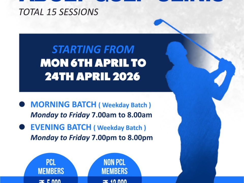 03/04/2026Published by Poona Club LTD at 03/04/2026Categories Adult Golf Clinic On 6th April to 24th April 2026 at Golf Course.